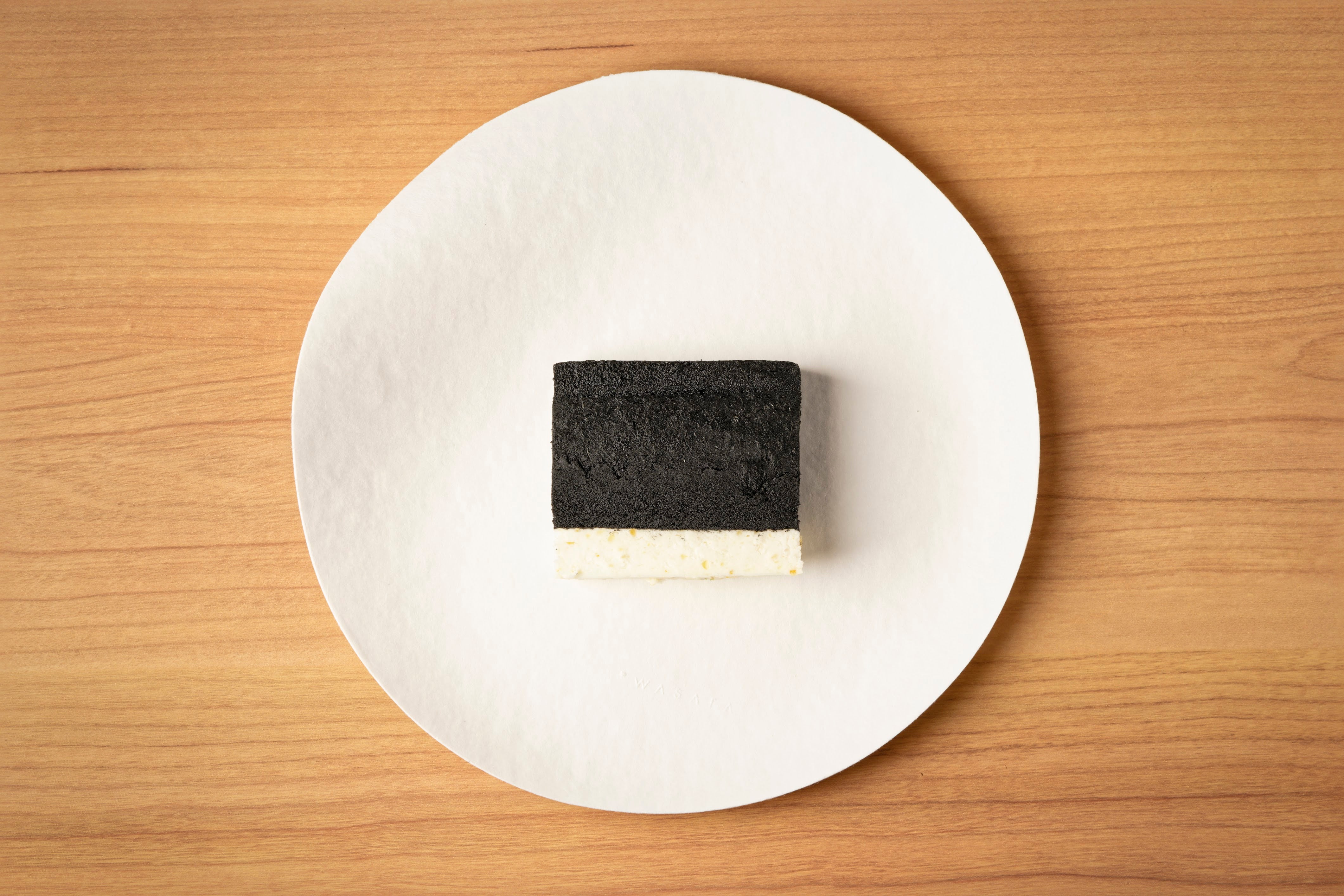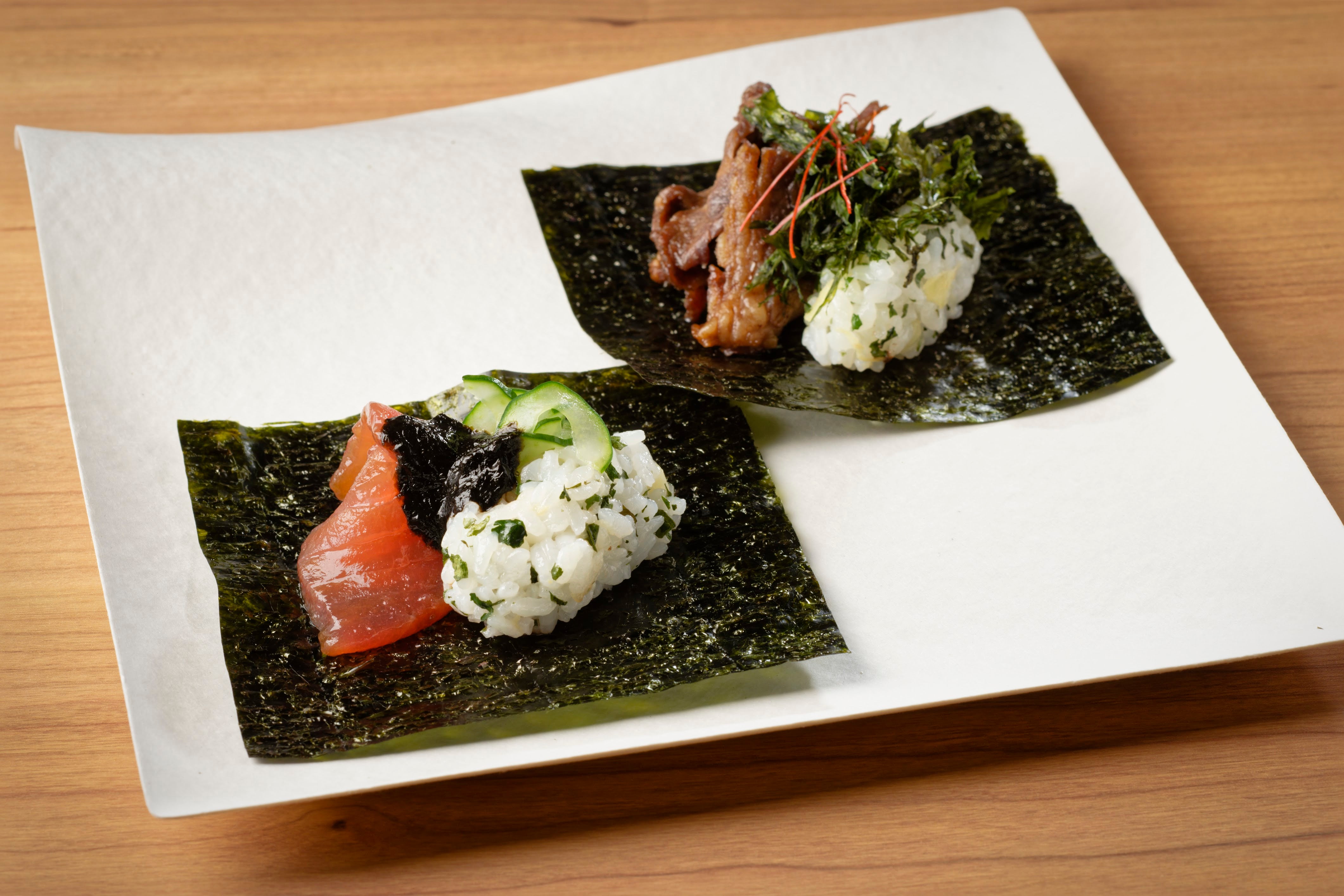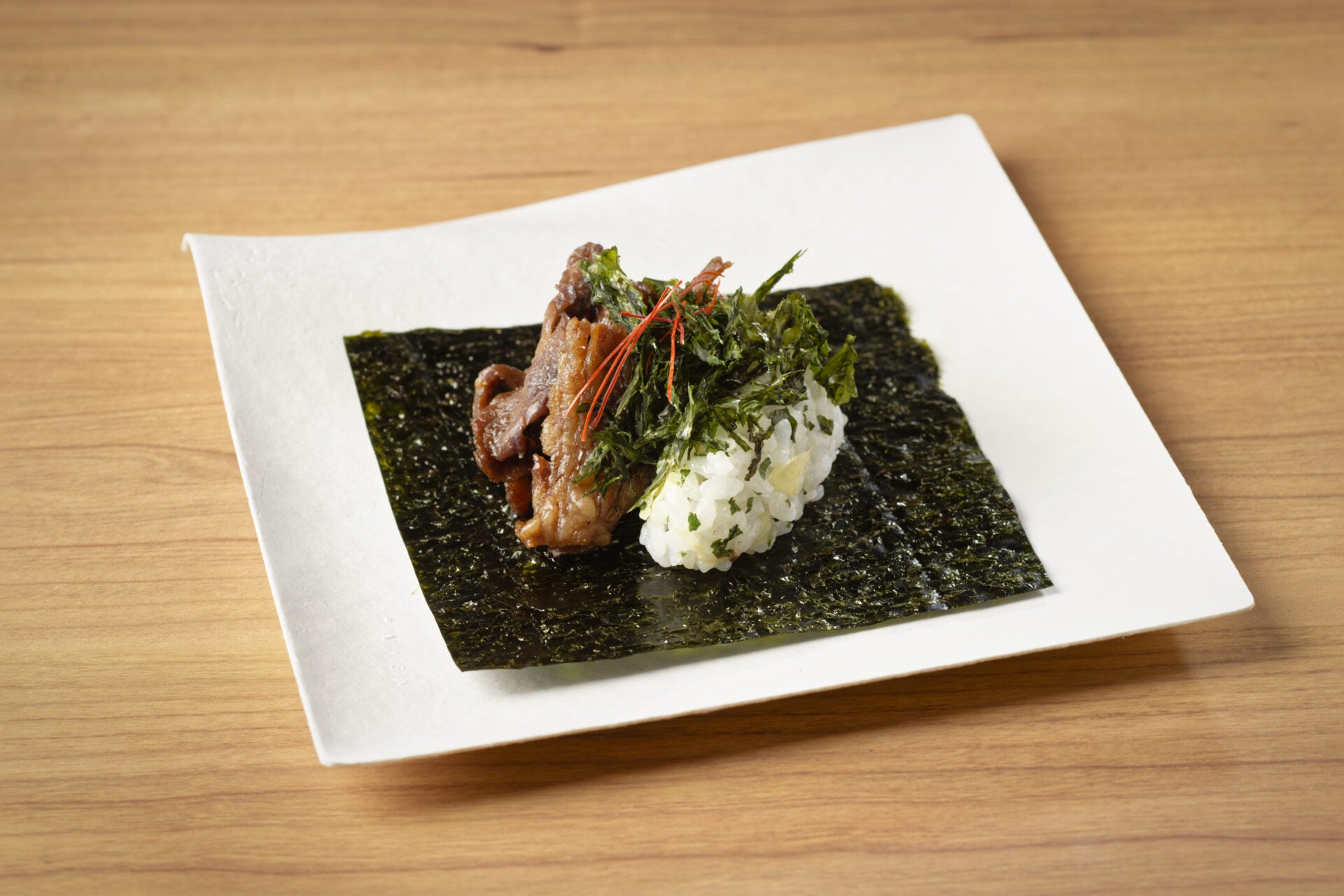 牛肉を香ばしく焼き上げてから、特製のすき焼きの割り下で煮たすき焼き煮。それを、千葉県産コシヒカリに「碾(てん)茶」と、生姜の甘酢漬けを混ぜた酢飯に添えました。海苔は、有明産の高級海苔と、香り高いバラ干し海苔を使っています。